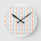 Este reloj tiene un diseño moderno de mediados de siglo de círculos unidos en tonos retro de verde azulado y naranja en un campo de blanco.