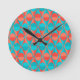 Este reloj tiene un diseño art deco de círculos naranjas de dos tonalidades y verde azulados dentro de triángulos verde azulados y naranjas de dos tonalidades.