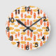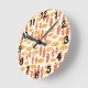 Este reloj de pared tiene un patrón repetido de óvalos en naranja retro y amarillo con ovalos blancos dispersos todos en un campo de blanco.