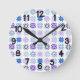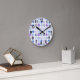 Este reloj de pared tiene un diseño invernal de diferentes copos de nieve en azul y violeta en filas.