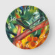 Colorida pintura del artista alemán Franz Marc de un mono en la jungla sentado en un árbol caído, mirando hacia atrás sobre su hombro. Aceite sobre lienzo con colores primarios brillantes y simplicidad cruda. "El mono" 1912.