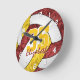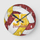 El reloj de pared con temática de voleibol de colores en equipo presenta la imagen estilizada y realista de un voleibol que tiene paneles de color marrón, dorado y blanco con números de cara de reloj sobreyacentes - un patrón kaleidoscópico artístico y floral se mezcla con los paneles de oro y marrón de voleibol - personalizar con el nombre del atleta en un tipo de letra autografo y número jersey en un tipo de letra de letra - por kby atz_d_zynes