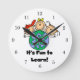 La figura niños de tres palillos rodea un globo del mundo y el texto lo lee "es diversión a aprender!" ¡en las camisetas temáticas de la escuela, las tarjetas, las tazas, los pegatinas, los botones, y el otro engranaje!