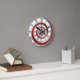 Una pared de clac con números romanos y una espiral roja que desaparece en infinito.