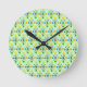 Este reloj está cubierto por un diseño moderno de mediados de siglo de estallidos atómicos retro en un fondo verde.