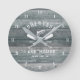 Añada un toque personalizado a su casa familiar junto al lago o casa de campo junto al lago con este reloj de pared, con remos cruzados y un pez puente sobre un fondo rústico de marisco verde azulado, con nombre familiar, ubicación en el lago y fecha establecida en plantillas de texto fáciles de usar.