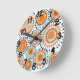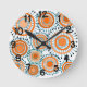 Este reloj de pared tiene un diseño de anillos y círculos en tonos naranjas con líneas verde azuladas cruzando detrás de ellos formando flores en un campo de blanco.