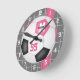 Este lindo y deportivo reloj de fútbol presenta un simple gráfico de fútbol en el que se puede personalizar el nombre del atleta, el número de monogramo y camiseta - algunos de los paneles negros de la pelota de fútbol han sido coloreados rosados - el fondo es gris medio con el acento de la red sobreyacente gráfico, rayas de barro rosadas y números de la cara del reloj blanco - de katz_d_zynes
