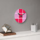 Reloj redondo geométrico cuadrado de líneas blancas rosadas.