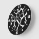 En el centro de este reloj de pared se exhibe una audaz huella animal de jirafa en blanco y negro. El anillo exterior tiene un fondo negro con números blancos para marcar las horas. Los números más grandes marcan cada cuarto de hora.