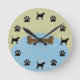 Labrador Retriever Clock, black lab silhouettes and dog paws on a light blue and khaki background with dog bone in the center. A unique clock for anyone that loves labs.