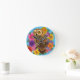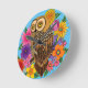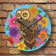 Lechuza sentada en medio de un ramo de flores de verano coloridas en un fondo azul