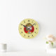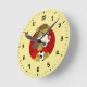 Relojes con ilustracion de cabeza de un lindo y sonriente vestido de león con vestido de deporte rojo sosteniendo una pelota de fútbol, en círculo rojo, ilustrado por Radka Kavalcova