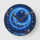 Espectacular escena nocturna con una brillante luna creciente iluminada con luz azul de neón. Suspendidos desde arriba están las estrellas brillantes, que proyectan una atmósfera mágica. En primer plano se deben mostrar las piedras en textura adornadas con delicadas luces de hadas, lo que realza la sensación de encanto. El azul profundo y los acentos metálicos evocan un paisaje onírico celestial.