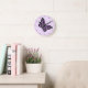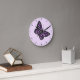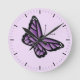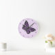 Este reloj presenta un hermoso ilustracion de una mariposa morada en un color de fondo lila. La cara del reloj es de líneas negras sencillas y de diseño.