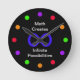 Math Clocks can be so cool and this math clock is no exception. The wall clock features the infinity math symbol in blue in the center on a black background with the words "Math Creates Infinite Possibilities" around the infinity symbol. The different times are represented by different colored circles (purple, red, orange and green) which are placed around the clock. This math clock is perfect for the math classroom or wherever those who have a love for math gather. Copyright Kathy Henis