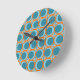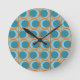 This wall clock has a mid-century modern design of open orange circles with solid teal circles running across the pattern with teal vertical lines and orange horizontal lines on a field of teal.