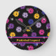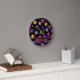 Neon rosa, amarillo y morado sobre el patrón de bola de picnic negro, texto personalizado Reloj redondo. Perfecto como regalo para el jugador de pickleball. Texto de personalizable en ambos lados ¡Feliz uso y mejores deseos para tus futuros juegos!