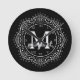 Crea tu propio reloj de pared de moda, estilo boho monogramado en color negro y plateado moderno - Círculo negro con monograma en el centro en gris plateado y blanco, ambos monogramados inicial y nombre en letras de guiones y una carta tradicional. Enmarcado por hermosas metalistadas plateadas de aspecto floral mandala. Número de la cara del reloj de efecto metálico plateado. Con el fondo negro correspondiente. Verdaderamente un reloj amable. Moda, decoración de boho personalizada.