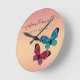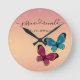 Hermoso reloj de pared de rose gold conectado por el amor que celebra a una pareja y su amor con sus nombres escritos en letra cursiva y conectados con un diseño en espiral y con una fecha significativa. Decorado con una ilustración adorable de dos mariposas, una morada y otra azul. Regalo moderno y elegante para una pareja que tendrá un valor tanto práctico como decorativo. Puedes hacerlo un regalo de aniversario, un regalo de boda o un regalo de compromiso y sí, está perfectamente bien si es un regalo que te estás haciendo a ti mismo y a tu pareja.