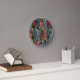 Este reloj de pared tiene un diseño art deco de óvalos con diseños abstractos dentro de cada uno en colores retro de rosa y azul.