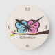 El reloj de pared de encargo del diseñador ofrece un ilustracion adorable del vector de uces par de búhos encaramados en una rama en esquemas de color hermosos. ¡Personalice con su nombre, el monograma, iniciales, o una fecha especial tal como su aniversario de boda!