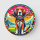 Adorable ilustracion al estilo personalizado de un perro con ojos brillantes, vestido con un collar y una cadena, colocado sobre un fondo circular de color.