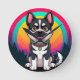 Ilustracion de un animado perro de dibujos animados sentado frente a un colorido fondo de arcoiris, con un ambiente lúdico y rodeado de un paisaje forestal sereno, que resalta la alegría y la vibrante arte.