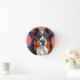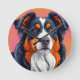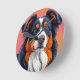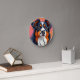 Una impresionante ilustración digital que presenta un perro tricolor con pelo negro, blanco y naranja sobre un fondo vibrante.