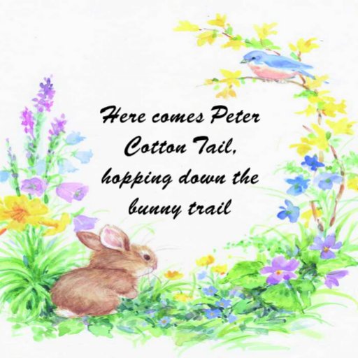 Este diseño presenta un conejito marrón como Peter Cotton Tail. Está sentado en una cama de verdes y flores formadas en un zapato de caballo. Las flores azules, verdes, moradas y amarillas están en flor y en la parte superior hay un pájaro encaramado sobre una vid de flores. Este diseño se presenta tanto en dos tamaños como en cuadrado.