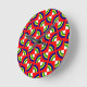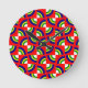 Este reloj tiene un diseño de Bauhaus de círculos de cuartos en azul, amarillo, verde y blanco sobre un campo de rojo.