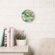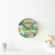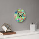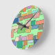 Este reloj de pared tiene un diseño moderno y boho de rectángulos unidos a líneas horizontales de varios tamaños y colores vivos.