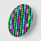 Este reloj de pared tiene un diseño moderno a mediados de siglo de rectángulos de neón rosa, verde y azul redondeados en tamaño creciente y decreciente corriendo verticalmente sobre un campo de negro.