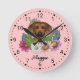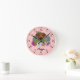 El original ilustracion personalizado de Destei de un adorable perro de raza Ridgeback Rhodesiano en la cabeza de cerca rodeado de coloridas flores silvestres de verano. Una flor rosa rubor, una flor morada, una flor rosa oscura y una flor margarita blanca, con hojas y ramas verdes. El color de fondo es rosa con un patrón de puntos polka claro. El color de fondo puede cambiarse a cualquier otro color y el patrón de puntos polka puede eliminarse, si así lo desea. Las horas están marcadas con números. Las horas y los minutos se muestran con una cara de reloj punteada. También hay un área de texto personalizable para un nombre u otro texto personalizado en una fuente de script encantadora.