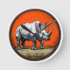 Representación estilizada de un rinoceronte presentada en un formato circular. El rinoceronte se muestra en una pose dinámica, mostrando su prominente cuerno y robusto cuerpo. El fondo es de un vibrante color naranja, que contrasta con los bordes negros del círculo, creando un efecto visual llamativo. El suelo debajo del rinoceronte se ilustra con detalles sutiles, asemejándose a un paisaje texturizado. Alrededor del rinoceronte hay arbustos espinosos o vegetación estilizada. El estilo general combina el realismo con el arte, produciendo una composición llamativa e impactante.