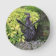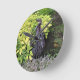 Un gallo metalizado lindo y tonto sentado en el jardín. Una divertida decoración de jardín.