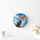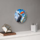 A vibrant Toco toucan with a large, orange beak perches on a branch in a lush tropical rainforest. The bird's black and white plumage contrasts beautifully against the bright blue sky and fluffy white clouds. The toucan's eye is a striking blue, adding to its colorful appearance. The background features a dense canopy of green leaves and a glimpse of a distant forest.