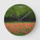 Un bonito contraste de color natural. Tulipanes de coral en plena floración en la Granja de Tulipanes de Madera en Woodburn, Oregón, con frondosas filas verdes de árboles en el fondo. ¡Una hermosa mañana de primavera! Foto tomada en abril de 2014.