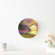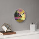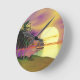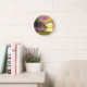 Reloj de pared con mi obra de arte de una escena tropical pacífica con un barco a vela pasando por una isla y un sol poniente.