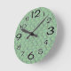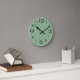 Este reloj de pared tiene un diseño art deco de círculos azules y púrpura que se conectan con líneas en un campo de verde claro.