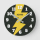 Yellow lighting bolt flash personalized round clock. Cool powerful zigzag thunderbolt design with big number dial. Add custom name or text. Customizable colors. Cool wall clock for home, office, kid's room etc. Thunder strike at midnight.