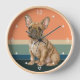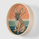 Un retrato de un adorable Bulldog francés marrón es la característica de este reloj. La imagen se coloca sobre un fondo retro, ligeramente perturbado y rayado de puesta de sol. Los números blancos y los marcadores en forma de diamante alrededor del perímetro hacen que el reloj sea fácil de leer. Perfecto para cualquiera que haya perdido el corazón por un francés.