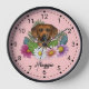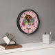 El original ilustracion personalizado de Destei de un adorable perro de raza Ridgeback Rhodesiano en la cabeza de cerca rodeado de coloridas flores silvestres de verano. Una flor rosa rubor, una flor morada, una flor rosa oscura y una flor margarita blanca, con hojas y ramas verdes. El color de fondo es rosa con un patrón de puntos polka claro. El color de fondo puede cambiarse a cualquier otro color y el patrón de puntos polka puede eliminarse, si así lo desea. Las horas están marcadas con números. Las horas y los minutos se muestran con una cara de reloj punteada. También hay un área de texto personalizable para un nombre u otro texto personalizado en una fuente de script encantadora.