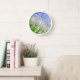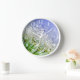 Reloj de pared redonda con una foto de semillas de león cubiertas con pequeñas gotas de rocío y números blancos.