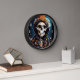 Un reloj con un ilustracion de un esqueleto usando una chaqueta encapuchada con el gorra de una bruja naranja encima. Rodeado de calabazas lindas y espeluznantes. Luna brillante en la parte de atrás con un solo bate volando cerca. Diseño divertido de Halloween de otoño o para fiestas o negocios de regalos con temas de muerte.