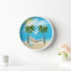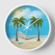 Hamaca colgada entre dos palmeras con estrellas de mar y chanclas en la arena de la playa del océano con nubes de verano.