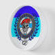 The skull and circle design is colored in blue and gray in a casual style.