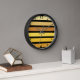 Reloj de pared redonda con marco de madera negra, decoración de arte en la pared y decoración de mobiliario casero accesorio impreso con tonos de rayas amarillas doradas sobre diseño de arte negro por TheFabricSeal en Zazzle.com #ZazzleMade TheFabricSeal ©️ original. Impresión de rayas clásicas con una combinación de colores elegante, elegante y de moda. Perfecto para mezclar y combinar productos con temática de color. 6 líneas de rayas incluyen tonos amarillos dorados de ámbar, rubio, canario, diente de león, oro, barra dorada, mostaza, azafrán, toscano, vainilla. Todo sobre un fondo negro ébano. Ideal para complementar la moda informal, el diseño de la decoración interior, las celebraciones, el entretenimiento, los deportes y más. Este exclusivo reloj de pared redonda de alta calidad con marco de madera elevada es muy personalizado y está imprimido con el proceso AcryliPrint®HD y cuenta con una ranura para colgar en la parte posterior preinstalada para facilitar el colgamiento y un diseño que no hace tictac.