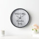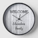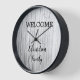 Moderno y rústico Bienvenido, nombre de la familia, fondo blanco de escotilla gris, reloj en la pared. Puede cambiar fácilmente el texto y agregar su nombre.