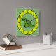 Tonos verdes y amarillos-verdes con un gran dinosaurio verde en un reloj de pared. ¿La decoración de una guardería, una sala de juegos para niños o un dormitorio para niños? ¡Un reloj lindo es el accesorio perfecto! Este reloj también haría un recién nacido inolvidable o un nuevo regalo de casa. Disponible en dos tamaños de reloj redondo, o un reloj cuadrado. Copyright Scarebaby Design.